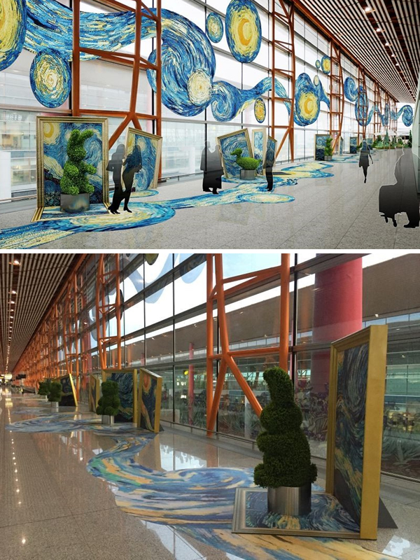 星空長廊以星空為主題,玻璃幕墻上有高為5.2米的星月夜圖案,沿途地面鋪設(shè)星月夜地貼,設(shè)置了六處動物造型綠植,有兔子、小熊、大象、麋鹿等動物造型,共計70米長。