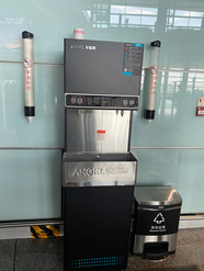 前往登機(jī)口的沿途衛(wèi)生間旁設(shè)有冷熱溫控飲水機(jī),可提供常溫水、冷水和熱水三種飲用水,并配有一次性紙杯。使用熱水時,先按童鎖鍵,再按熱水鍵出水,松手停止出水;使用常溫水和冷水時,先按常溫水或者冷水鍵出水,松手停止出水。