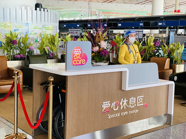 該愛心休息區(qū)位于出發(fā)層核心區(qū)域,配有醒目的標(biāo)志、專業(yè)的團(tuán)隊和舒適的空間,可為預(yù)約首都機(jī)場特殊旅客服務(wù)的老年人、殘疾人、孕婦、兩院院士等特殊人群提供舒適的休息環(huán)境。同時,愛心休息區(qū)值守問詢員還可隨時為休息旅客提供問訊、航班出發(fā)提醒、輪椅借用、免費(fèi)電瓶車及愛心陪伴服務(wù)。