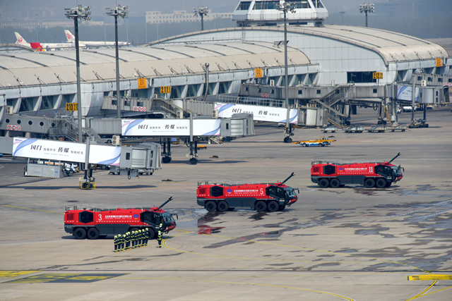 壯觀絢麗的三道水門看似并不復(fù)雜,卻絕非“大力出奇跡”的簡單操作。參保人員先后數(shù)十次利用747實(shí)體訓(xùn)練飛機(jī)開展訓(xùn)練,從車輛點(diǎn)位確定到射水時間把控,從依據(jù)風(fēng)向調(diào)整水炮方向到兩車進(jìn)行水流對接,每一個細(xì)節(jié)都需要反復(fù)琢磨。同時,為使水門能夠保持較長的時間,保障組人員精密測算,確定了現(xiàn)場車輛距離條件下形成水門的最小射流,既能保證水門的完美形態(tài),又能將時間控制地精準(zhǔn)。